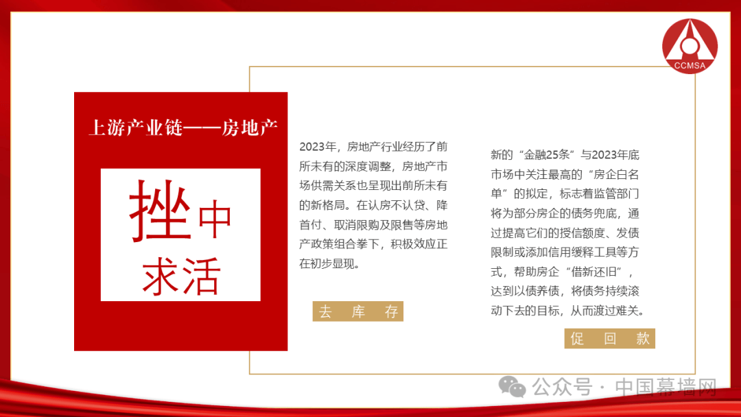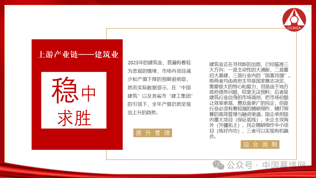 当前经济发展面临着三大挑战:一是消费信心需要时间来修复;二是国际贸易出口形势严峻;三是房地产遗留问题亟待解决,特别是与建筑总包、门窗幕墙分包、材料企业之间的“三角债”问题。回望过去的一年,中国经济经历了下滑、扭转、恢复、回稳的四个阶段;建筑业依然是拉动内需的一大利器,稳中求胜;房地产负增长严重但体量仍然巨大,正在挫中求活;门窗幕墙行业产值下降但信心不减,要首重质再重量。