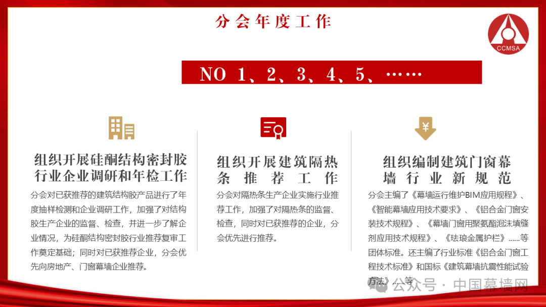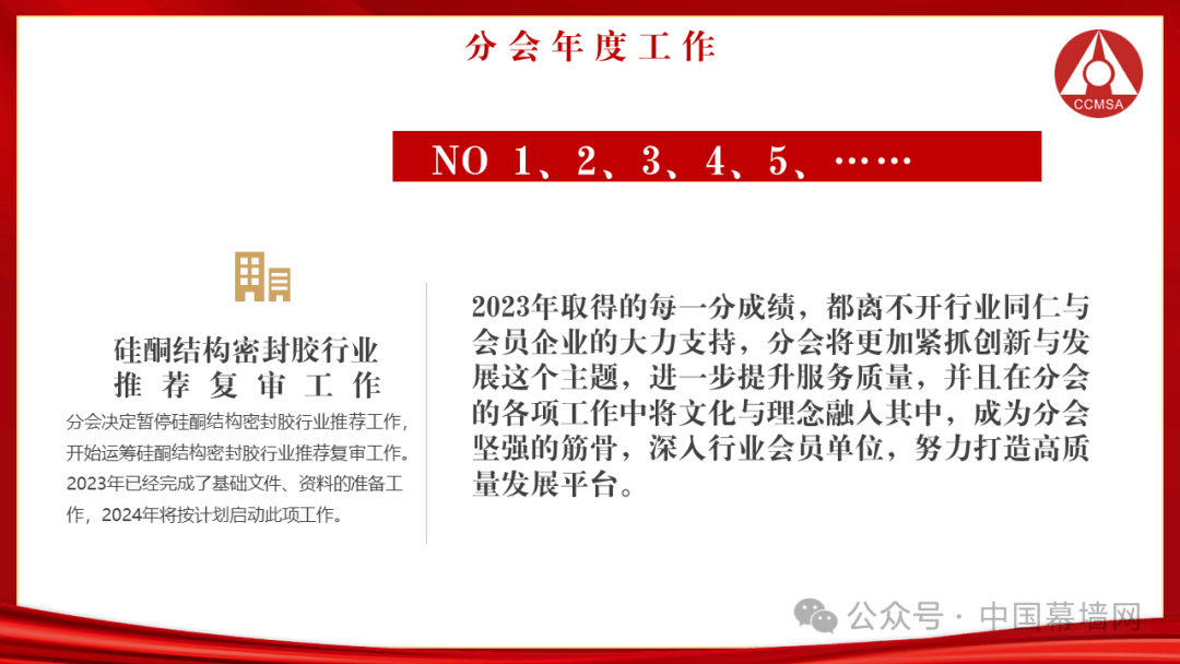 在国家精准施策、行业积极践行的大背景下,中国建筑金属结构协会铝门窗幕墙分会在2022年工作的基础上,对行业内既有及新开展的各项主要工作有了更深的认识,也有了更具前沿目光的运作方式,融合“基础工作”,强化“分会价值提升”,提升文化理念与粘性,创造新突破。