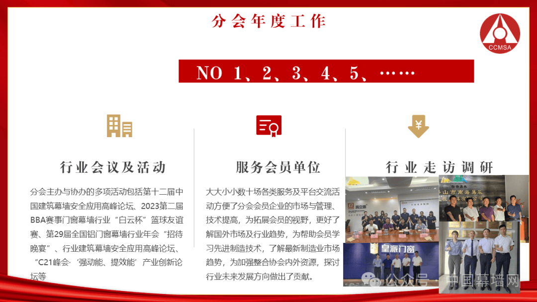 以开拓的眼光看待行业,以发展的目标推动行业,2023门窗技术培训班的会员企业服务活动,分会一口气举办了两期;2023全国幕墙设计及顾问专家会、第三届718上海幕墙共享设计节更是推动行业设计水平提高的重要活动,大大小小数十场各类服务及平台交流活动方便了分会会员企业的市场与管理、技术提高,为拓展会员的视野,更好了解国外市场及行业趋势,为帮助会员学习先进制造技术,了解最新制造业市场趋势,为加强整合协会内外资源,探讨行业未来发展方向做出了贡献。