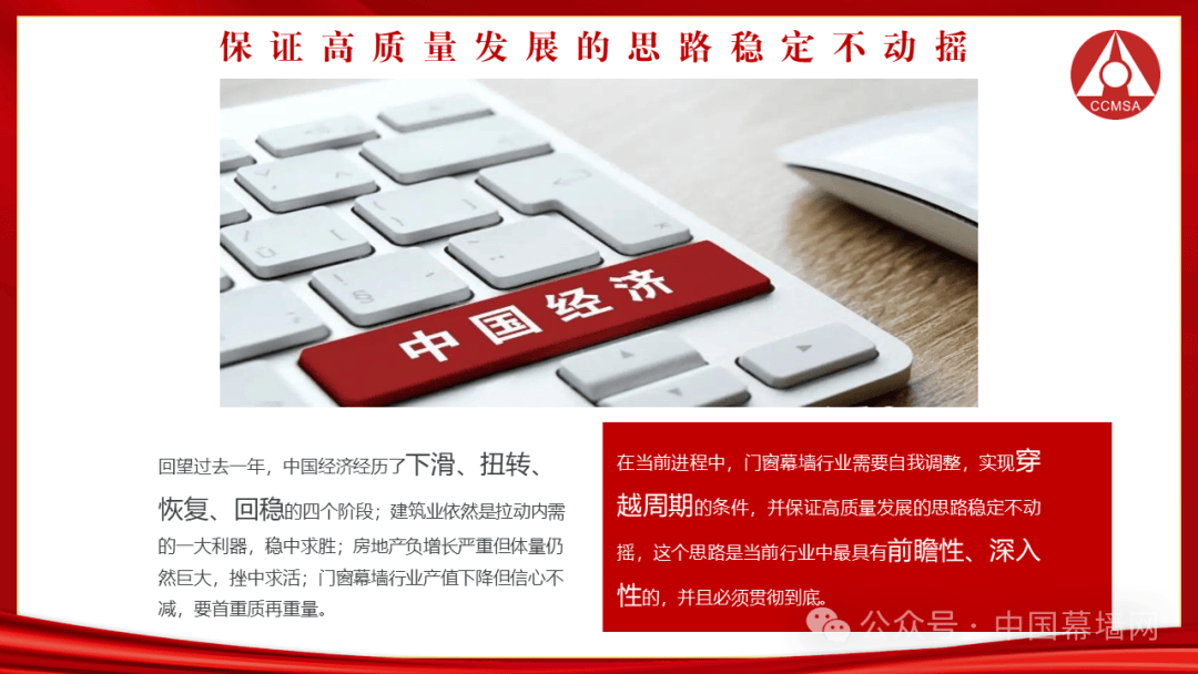在当前进程中,门窗幕墙行业需要自我调整,实现穿越周期的条件,并保证高质量发展的思路稳定不动摇,这个思路是当前行业中最具有前瞻性、深入性的,并且必须贯彻到底。
