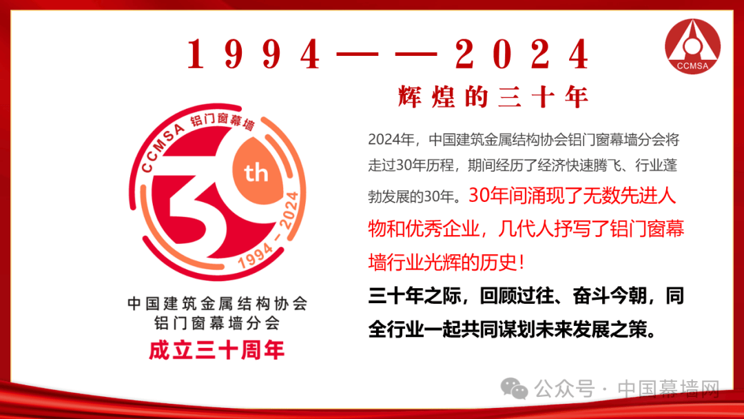 2024年,中国建筑金属结构协会铝门窗幕墙分会(以下简称:分会)走过了30年历程,步入而立之年,我们共同经历了经济快速腾飞、行业蓬勃发展的30年!