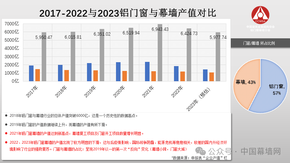 与上一年度相比,门窗幕墙行业的产值、利润率都呈现整体下降的趋势。2023年度统计的行业数据统计工作反映,总产值5900亿左右,这与后疫情影响、国际战争阴霾、能源危机等息息相关,较差的国内外经济环境影响了行业的强势复苏。其中门窗受房地产影响,较幕墙的下滑更为明显。