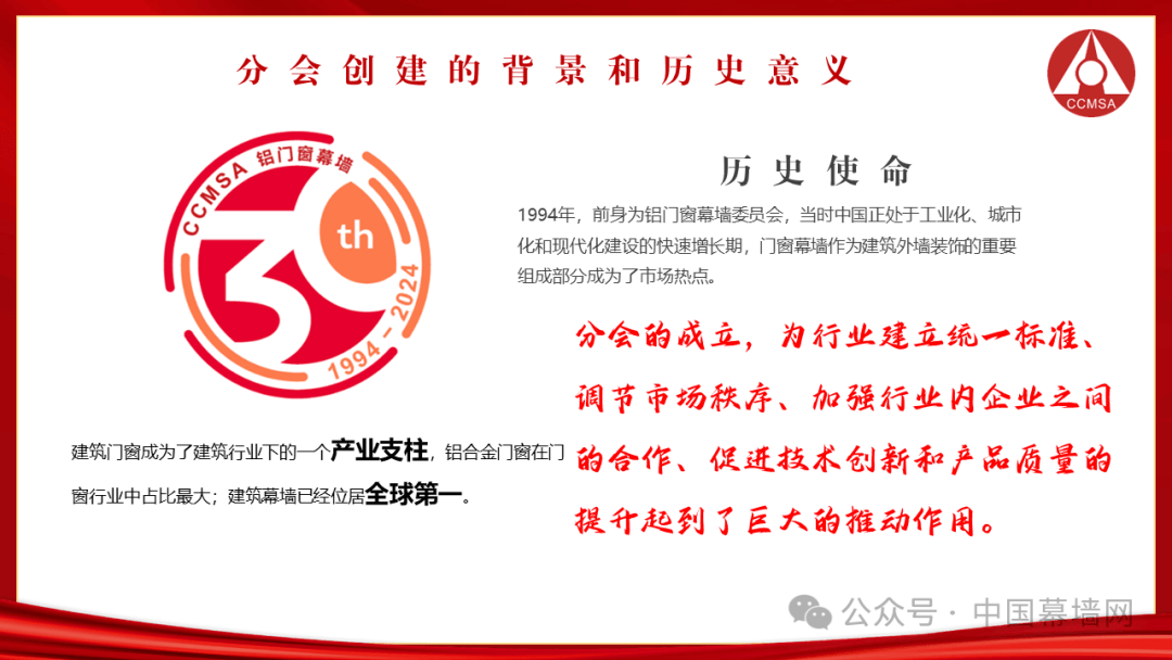 中国建筑金属结构协会铝门窗幕墙分会,创立于1994年,前身为铝门窗幕墙委员会,当时中国正处于工业化、城市化和现代化建设的快速增长期,门窗幕墙作为建筑外墙装饰的重要组成部分成为了市场热点。当时行业内存在很多问题,如产品质量不稳定、标准不统一,以及市场秩序混乱等。分会的成立,为行业建立统一标准、调节市场秩序、加强行业内企业之间的合作、促进技术创新和产品质量的提升起到了巨大的推动作用。
