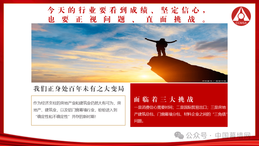 今天的铝门窗幕墙行业要看到成绩、坚定信心;也要正视问题、直面挑战——全体门窗幕墙人正身处百年未有之大变局!!!把握优势、坚定前行信心,才能推动行业乘风破浪向前、迈上更高台阶。